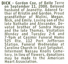 Gordon Coe Dick was born in 1939 in Mineola and lived in Roslyn Estates. His older brother,Thomas Crawford Dick, died in 2002. His younger sister, Sandra Jayne Hayes now lives in Shreveport, LA.