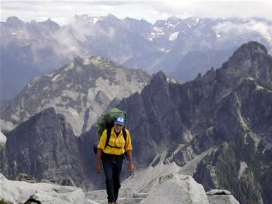 | This picture was taken on a climb to the summit of Vesper Peak in central Cascade Range. I am hauling a lot of gear as I spent three nights up there with camping equipment and rock digging tools (the site is known for garnets). |